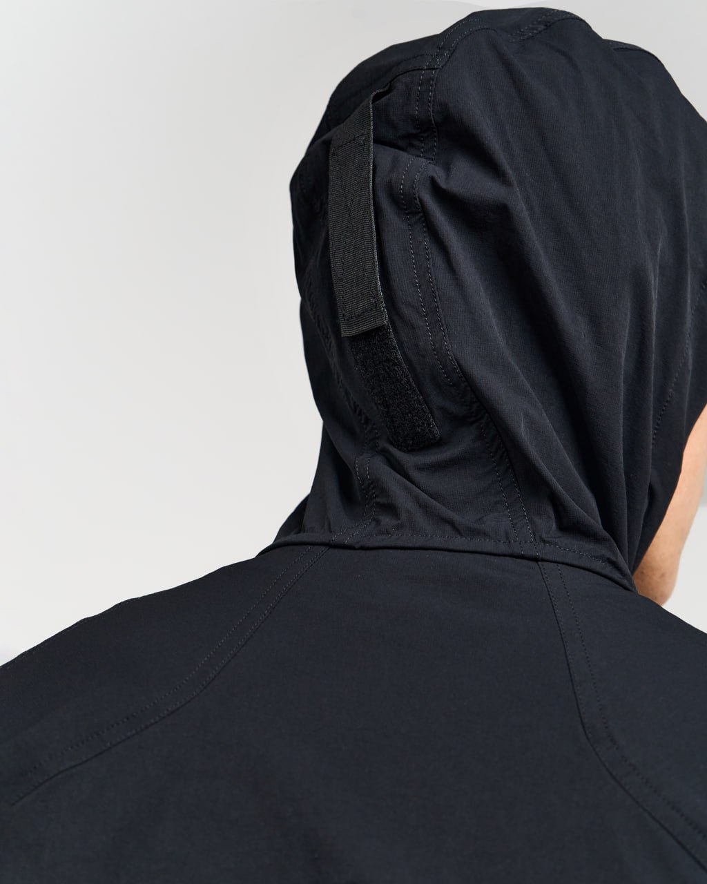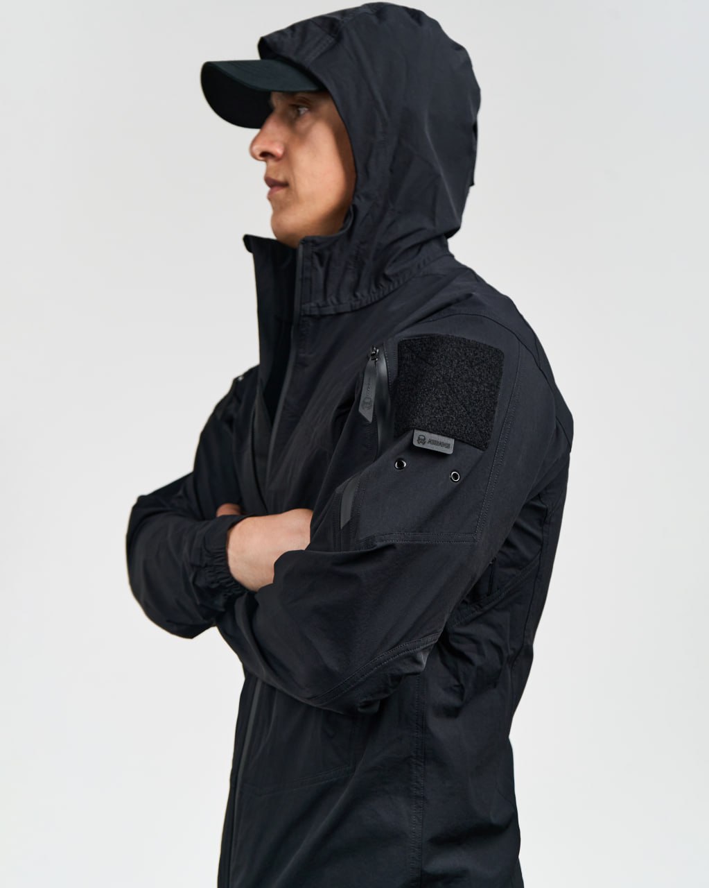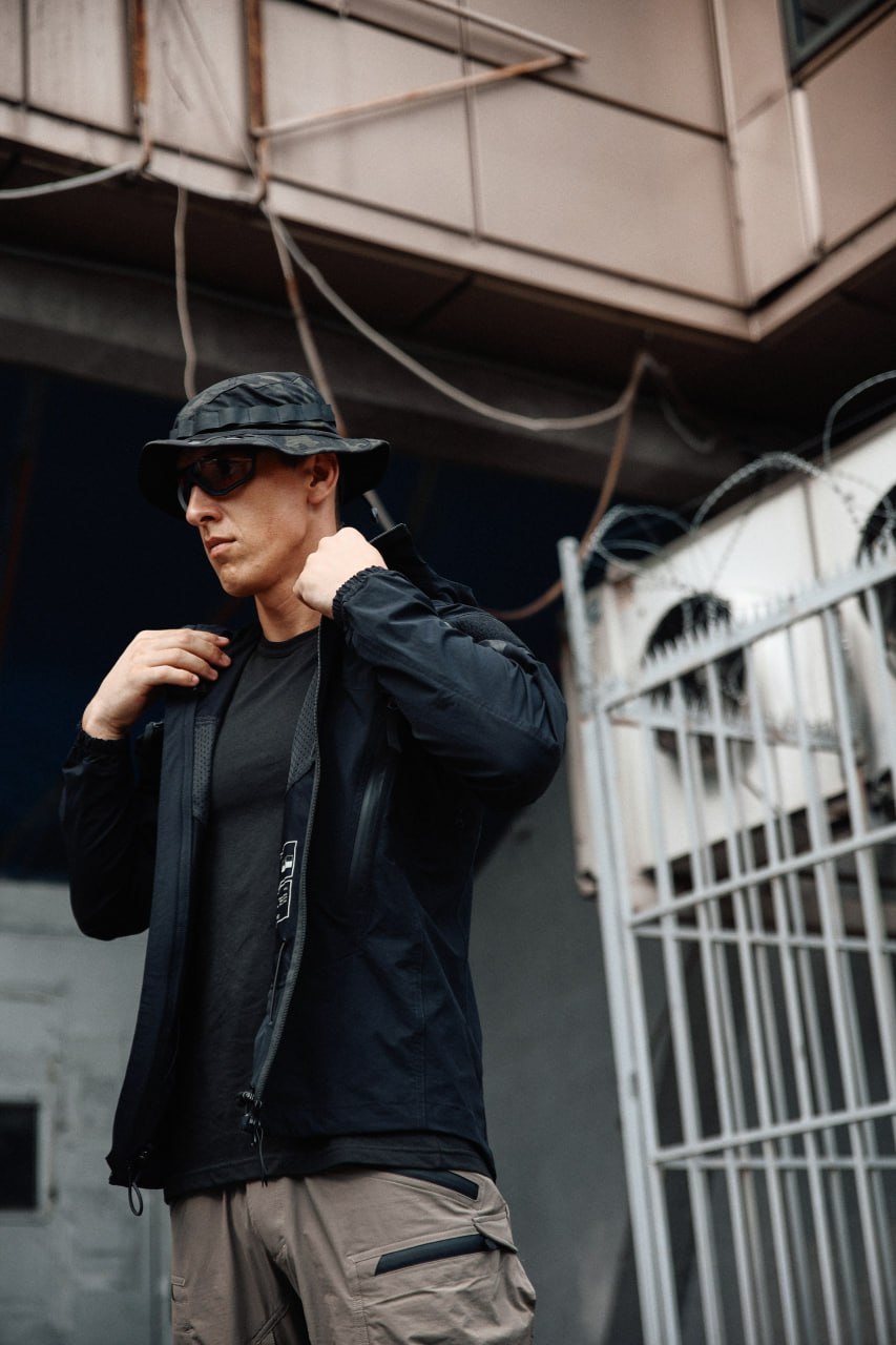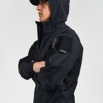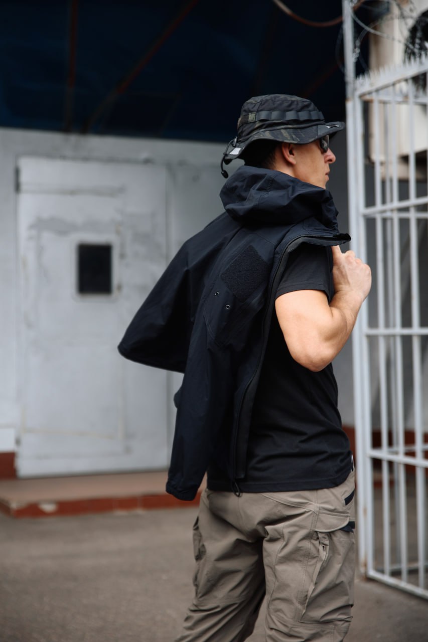 - Капюшон с регулируемым объемом: плотно сидит на голове, не мешает обзору и защищает от непогоды.