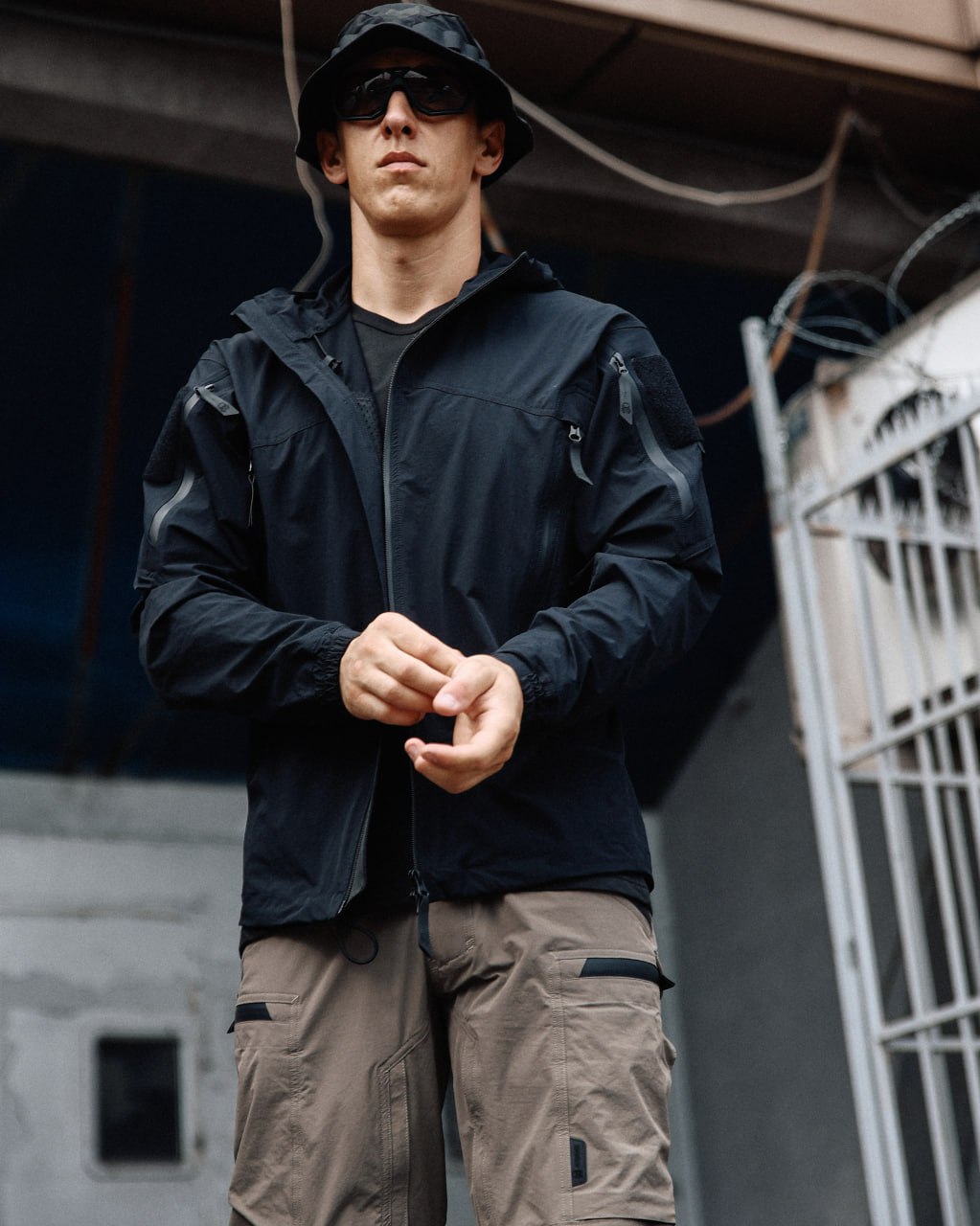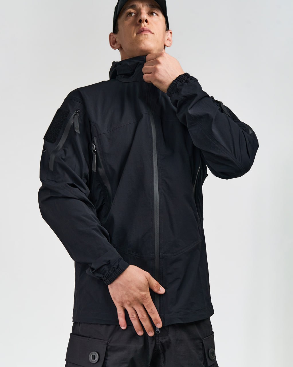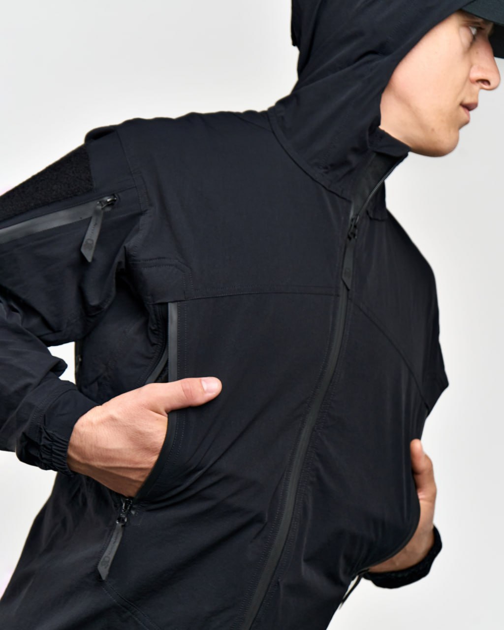 - Капюшон с регулируемым объемом: плотно сидит на голове, не мешает обзору и защищает от непогоды.